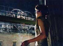 A suicide fall from the roof of The Million Dollar Hotel in the film's opening sequence gives us Hopper-esque peaks into the windows and lives of the rooms on the way down to the pavement while the narrator--and suicide-- tells us: "Life is perfect. I guess you don't see it all that clearly when you're, you know, alive." It's much more graphically piquant than the Germanic zombie drone of the angels eavesdropping onto humanity in Wenders' overrated Wings of Desire. His use of cinematic Hopper homage has the same power as the narratives-within-narratives of German Expressionist silents and the perverse voyeurism of Alfred Hitchcock to convey personal (aesthetic) obsessions while keying into social tumult through the shared act of film watching. (Brian De Palma has always understood this, even if his critics haven't.) "The job of a film director is a particular one," narrates John Malkovich during the Wenders-directed conclusion of Michaelangelo Antonioni and Wenders' Beyond the Clouds. That line catapults Wenders' crane shot recording the private moments of the anonymous people at the hotel where the director is staying, summing up that film's study of voyeurism and moral imagination. That shot was scored to U2 and Brian Eno's Your Blue Room. In Wenders' latest, the band's "First Time" gets a visual lift from the opening chrome-blue aerial shots of L.A. skyscrapers with the neon sign for The Million Dollar Hotel invading the descending frame. These image-music combos have the imaginative pop vitality of the Pet Shop Boys' cover of U2's "Where the Streets Have No Name" (with its brilliant bridge into "I Need You Baby"). Wenders' images temper Bono's vocals while placing the evocative ambient swirls within the context of cinema's and society's neglected. Wenders' particular job: to brand onto our imaginations the existence and social circumstance of the lonely with the recovered intensity of Hopper's "Nighthawks". Star Jeremy Davies justifies this gorgeous aesthetic conceit by giving it its human pulse, establishing the heightened point of view of the film's style.