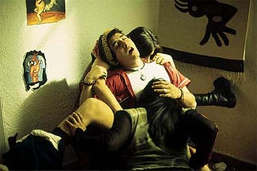The sexual scenes in Y tu mama tambien are unusually graphic and very sexy. Cuaron uses them for a structural purpose, the meaning of which makes them even more sexy. The first pair of sex scenes are between the boys and their girlfriends. Then, there's a scene of Tenoch and Julio masturbating on the diving boards at the pool (they both come when they think of Luisa). On the road trip, Luisa first has sex with Tenoch and then, later, with Julio. Both of their feelings hurt, they reveal that they had sex with each others' girlfriends. Cuaron's deft direction of these scenes dramatizes specifically hetero male bonding and hetero male insecurity. However, it resonates with the adolescent experience of everyone in the audience. Cuaron's structural organization of these scenes links the two boys' sexual activities as the displacement of their attraction for each other - the biggest secret of "straight" male adolescence.