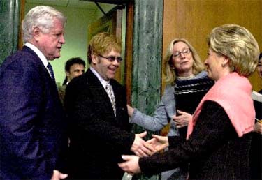 Sir Elton John shakes hands with Sen. Hillary Clinton as Sen. Edward Kennedy looks on following Elton John's testimony before the U.S. Senate